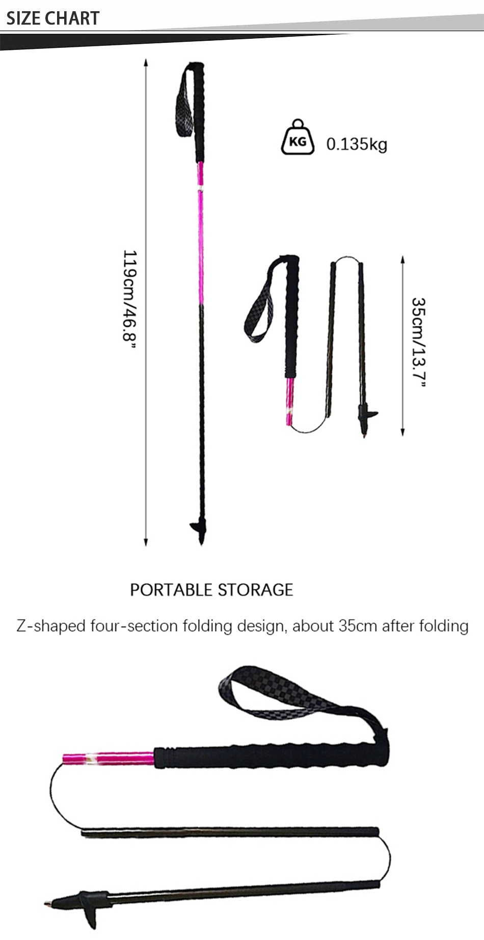 製品 : 135g の超軽量 3K カーボン ファイバー製屋外用折りたたみ式ハイキング トレッキング ポールは、耐久性のある構造、人間工学に基づいたグリップ、コンパクトな携帯性を特徴としており、ノルディック ウォーキングや挑戦的な冒険に安定性とサポートを提供します。