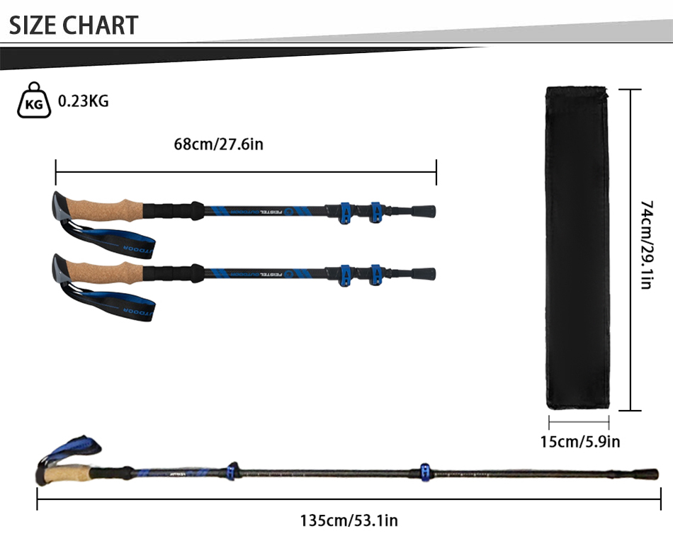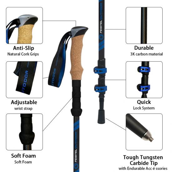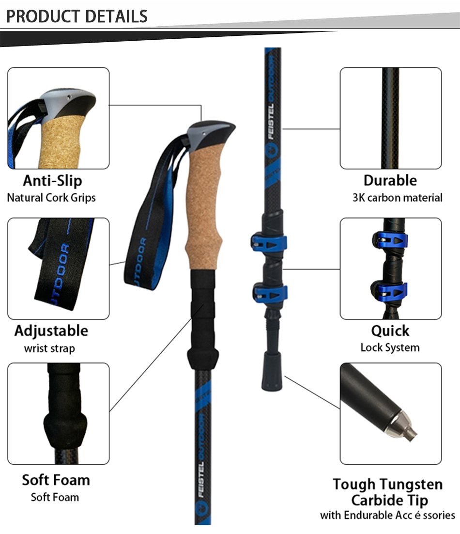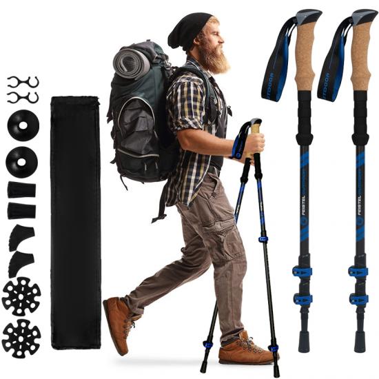 製品 : この 2 個パックのポータブル トレッキング ポールは、軽量構造、高さ調節可能、EVA コルク ハンドル、耐久性のある先端が特徴で、屋外での登山、ハイキング、険しいトレイルでの冒険に信頼できるサポートを提供します。