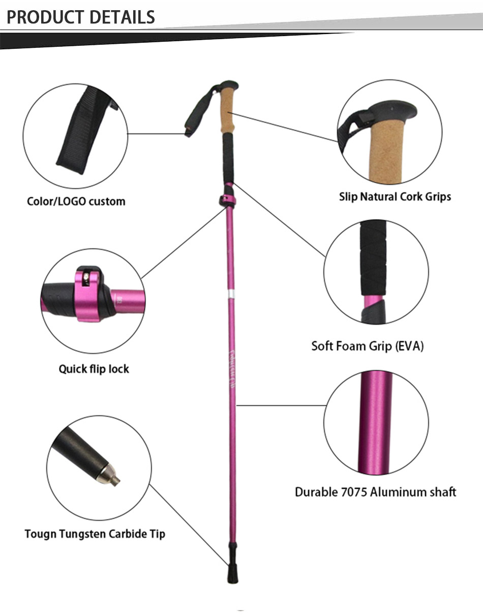 製品 : 5 セクションの折りたたみ式航空アルミニウム 7075 トレッキング ポールは、軽量でありながら強度があり、安全な調整機能とコンパクトな携帯性を備え、ウォーキング、ハイキング、トラッキング、そして挑戦的なアウトドア アドベンチャーに信頼性の高いサポートを提供します。