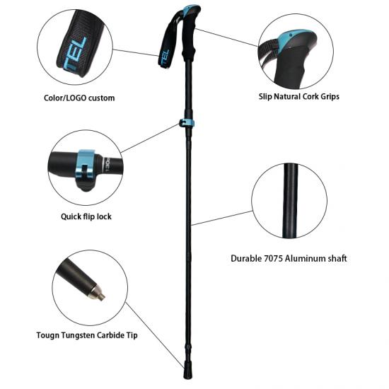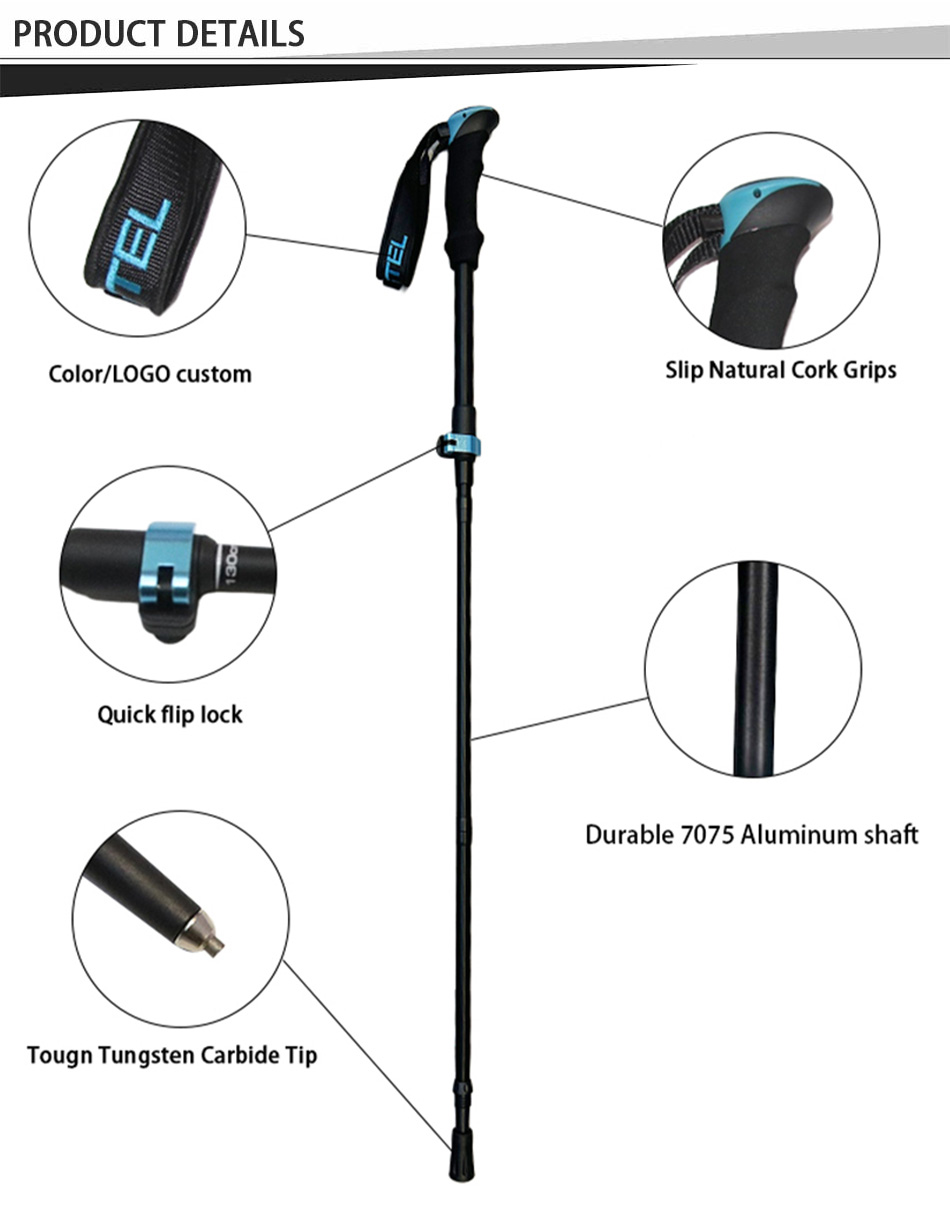 製品 : 5 セクションの 7075 アルミニウム合金製伸縮式折りたたみ式ウォーキングスティックは、軽量で強度があり、安全に調整でき、EVA ハンドルを備えているため、ハイキング、トレッキング、屋外ウォーキング中に快適で安定したサポートを提供します。