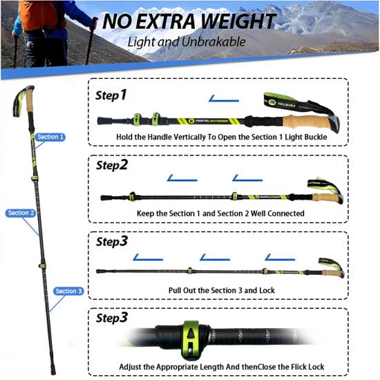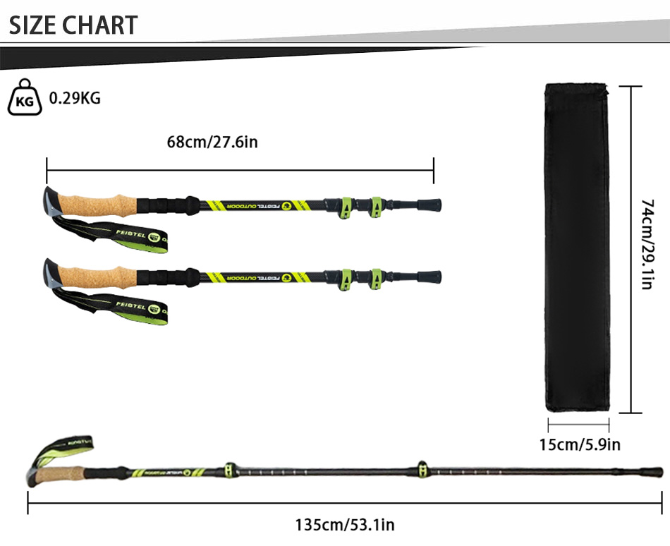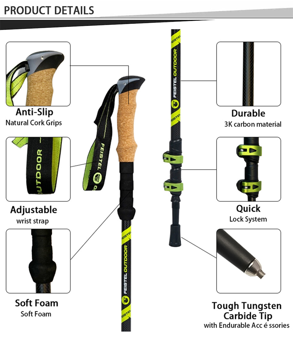 製品 : 調節可能な2本パックのコルクグリップ、軽量で伸縮性のある丈夫な航空機用アルミニウム製ハイキングポールは、安定したサポート、衝撃の軽減、高さのカスタマイズが可能で、さまざまな屋外地形での快適なトレッキングを実現します