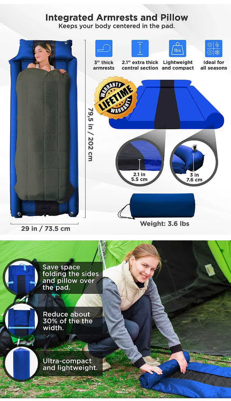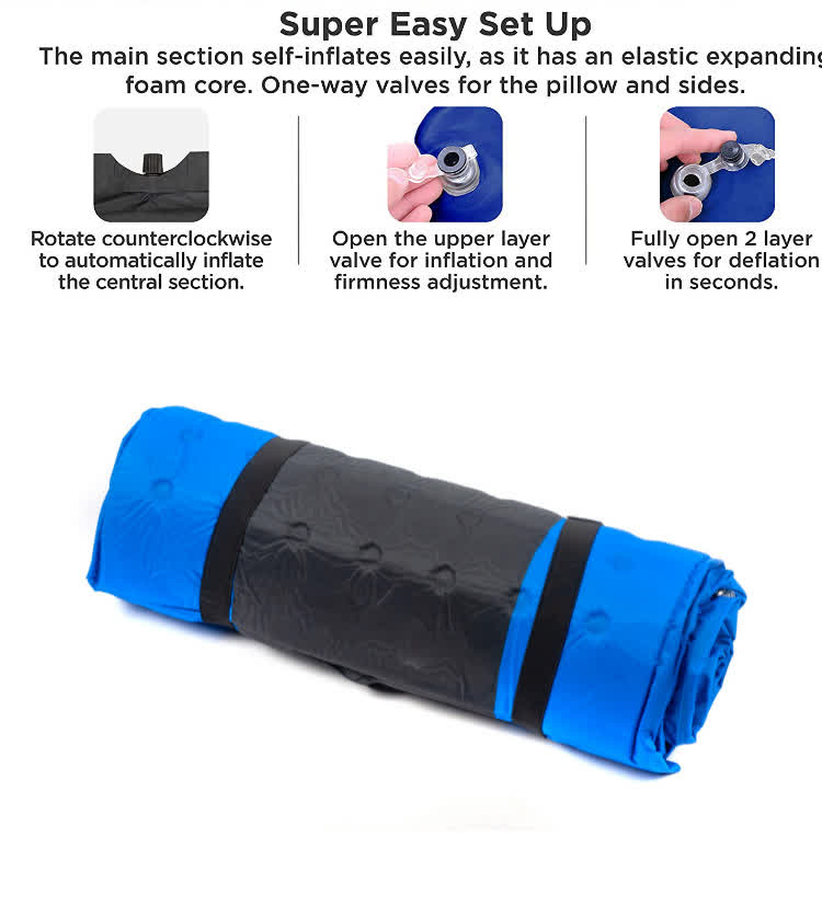 使用時に通気孔を開けるだけで、 シングルセルフインフレートスリーピングパッドが 自動的に膨張するため、便利で迅速です。同時にクッションの厚みと幅を十分に確保し、快適な寝心地を実現します。ここには厚さ3cmのインフレータブルクッションと厚さ5cmのインフレータブルクッションの2つのスタイルがあります。キャンプの際、屋外キャンプ用自動膨張クッションを持参すると、睡眠の質が向上するだけでなく、道路での疲労による身体的不快感を軽減することもできます。