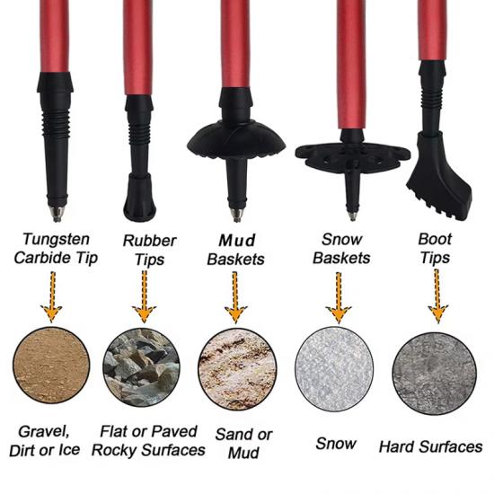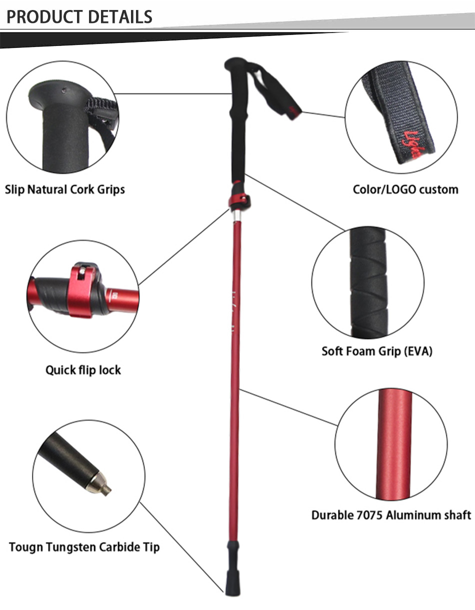 製品 : 工場価格のアルミ合金製超軽量折りたたみトレッキング ポールは、ハイキング、キャンプ、バックパッキングに調整可能な安定性を提供し、さまざまな地形での冒険で軽量で耐久性があり、信頼性の高いパフォーマンスを実現します。
