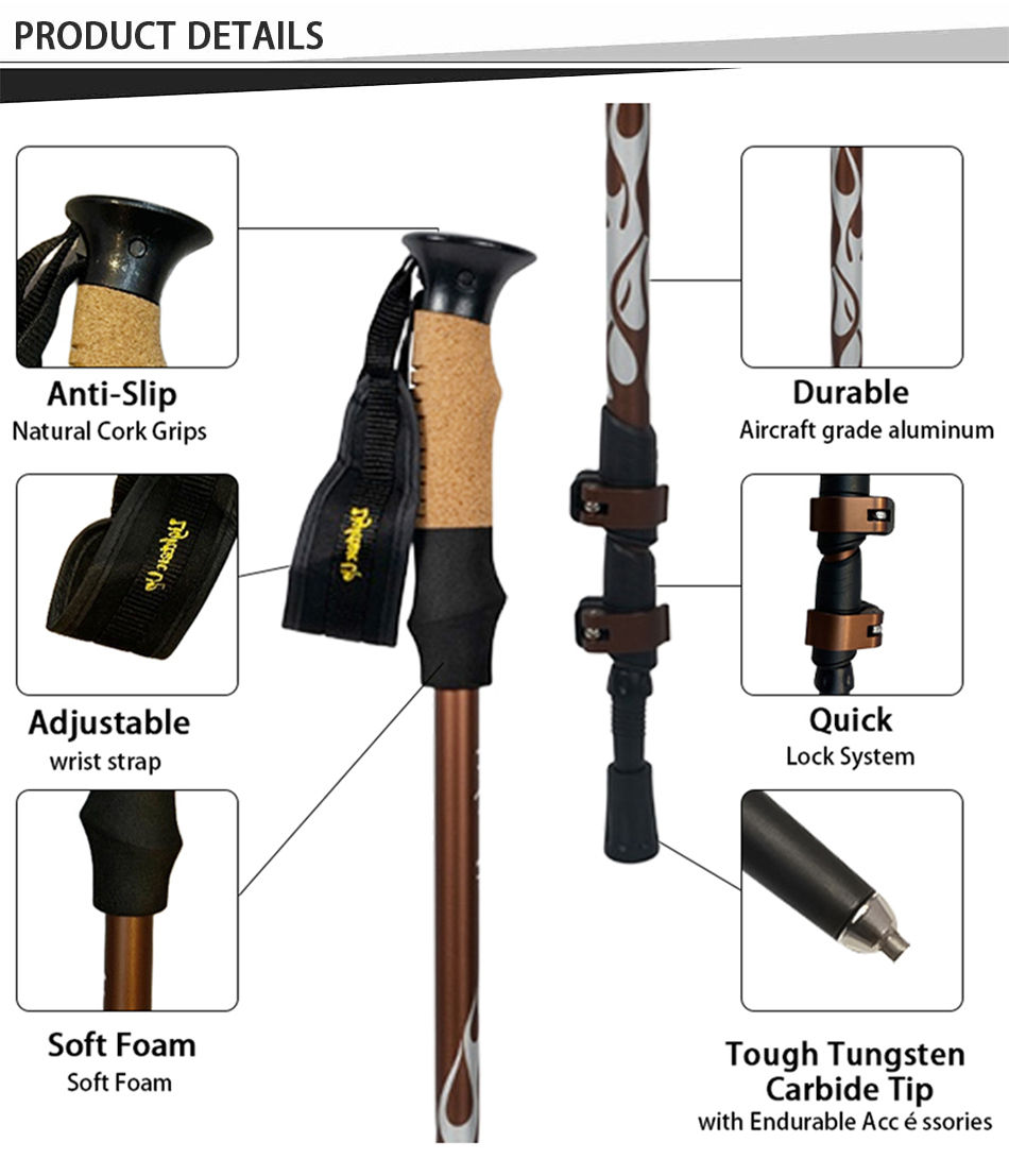 製品 : 高品質のスキーポールは、カーボン構造、伸縮式デザイン、松葉杖スタイルのサポートを特徴としており、ノルディックウォーキング、トレッキング、スキー、アウトドアアドベンチャーに軽量の強度と信頼性の高い安定性を提供します。