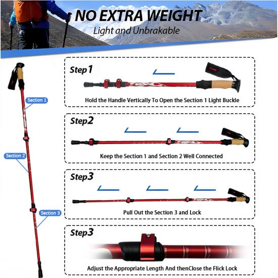 製品 : 軽量の航空グレードアルミ製トレッキングポールは、快適なグリップと多用途の先端アクセサリーを備え、アクティブなアウトドアハイキング、トレッキング、冒険旅行に安定性、耐久性、サポートを提供します