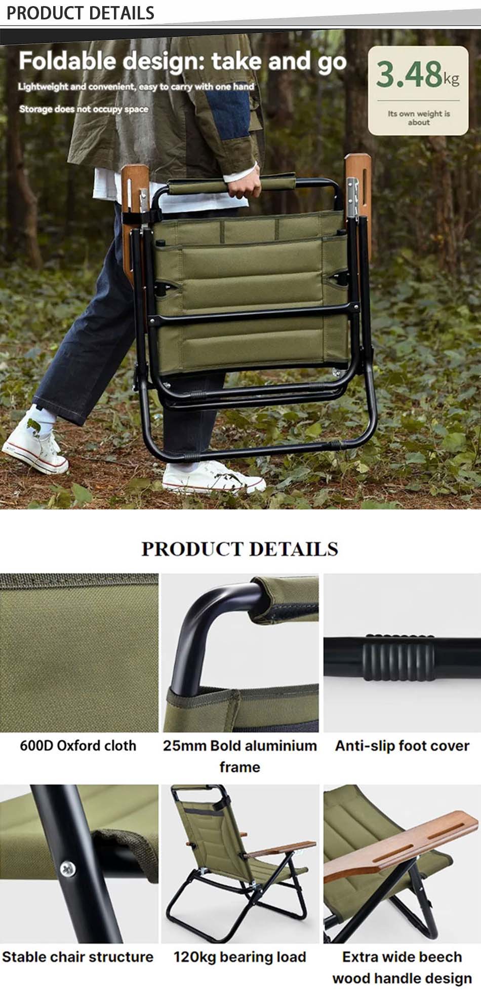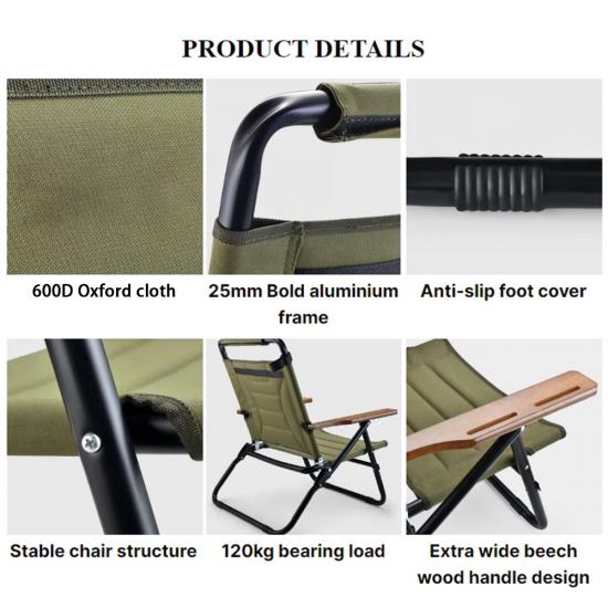 ブランド : 安徽省ファイステル工場 製造業の関連 : OEMとODM 製品 : このキャンプ用折りたたみ式木製ラウンジチェアは、頑丈なフレーム、人間工学に基づいたリクライニング デザイン、コンパクトな折りたたみ構造を特徴としており、ビーチ、キャンプ場、裏庭でのリラックスに最適です。
