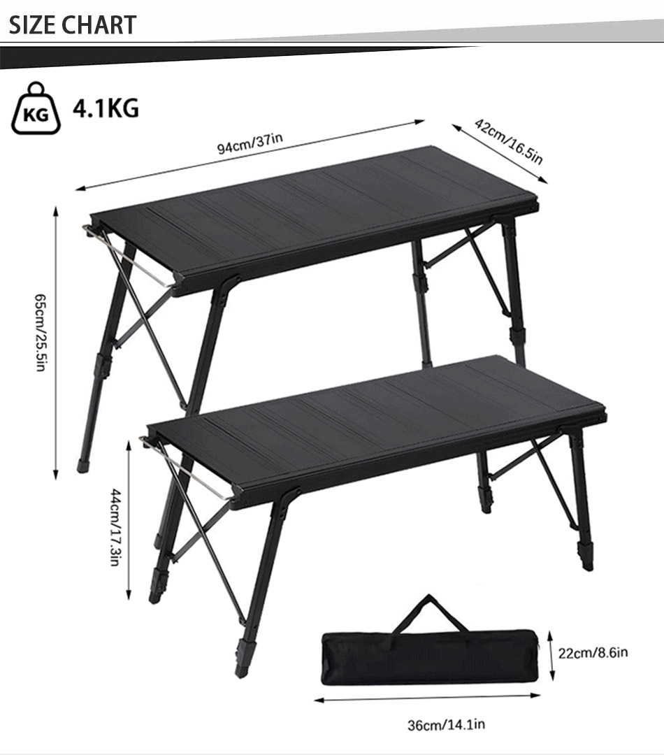 ブランド:安徽省FEISTEL FACTORY 関連製造: OEM & ODM 製品:アウトドアポータブル折りたたみロールアップピクニックテーブル:高さ調節可能、セットアップが簡単、キャンプ、ピクニック、アウトドアアクティビティ用のコンパクトなキャリーバッグを備えた軽量で耐久性のあるアルミニウムデザイン。