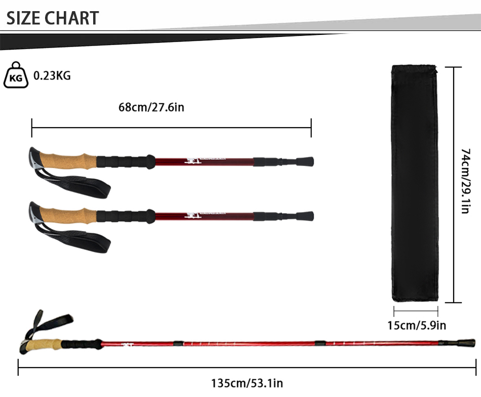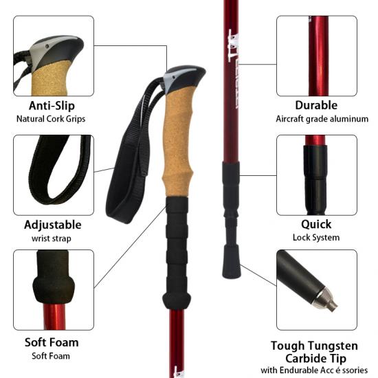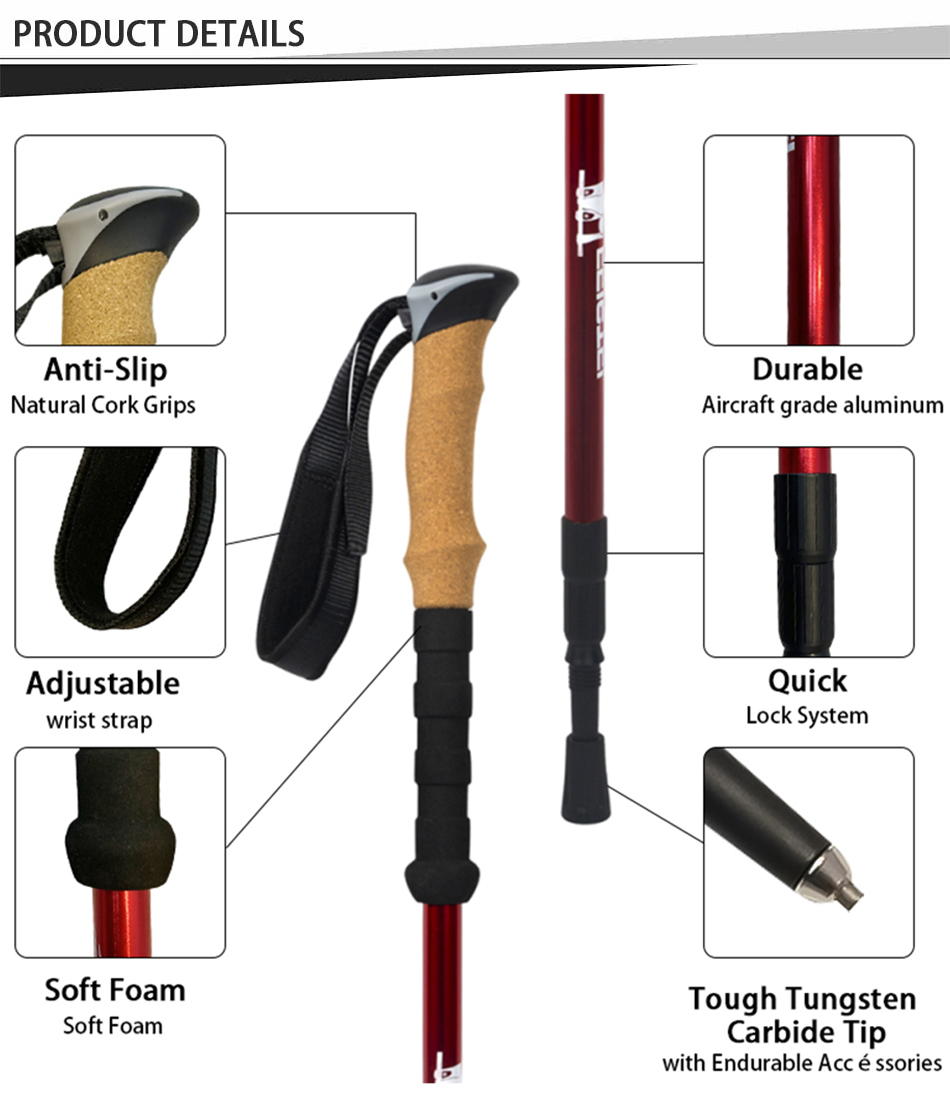 製品 : 屋外用アルミ伸縮式ノルディックウォーキングスティックは、内部ロック、耐衝撃システム、快適なコルクと EVA ハンドルを備えており、ハイキングや日常のウォーキングに安定したサポートを提供します。