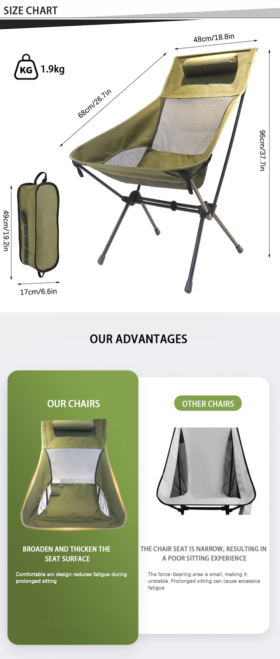 製品 : 屋外用の通気性のある幅広のムーンチェアは、平行バーとサポート力のあるハイバックを備えたポータブル折りたたみデザインが特徴で、キャンプ、ビーチ旅行、リラクゼーションに快適さを提供します。