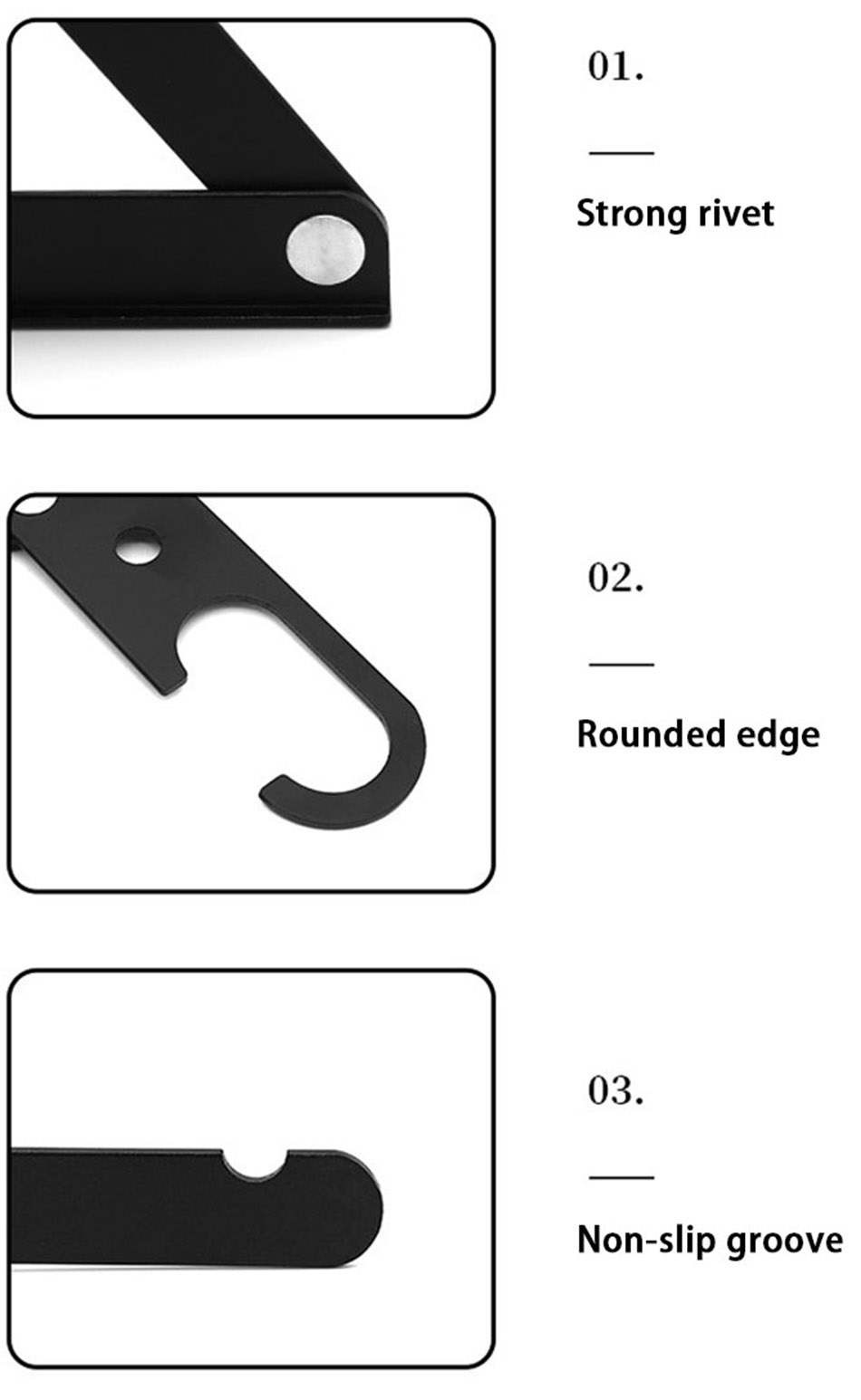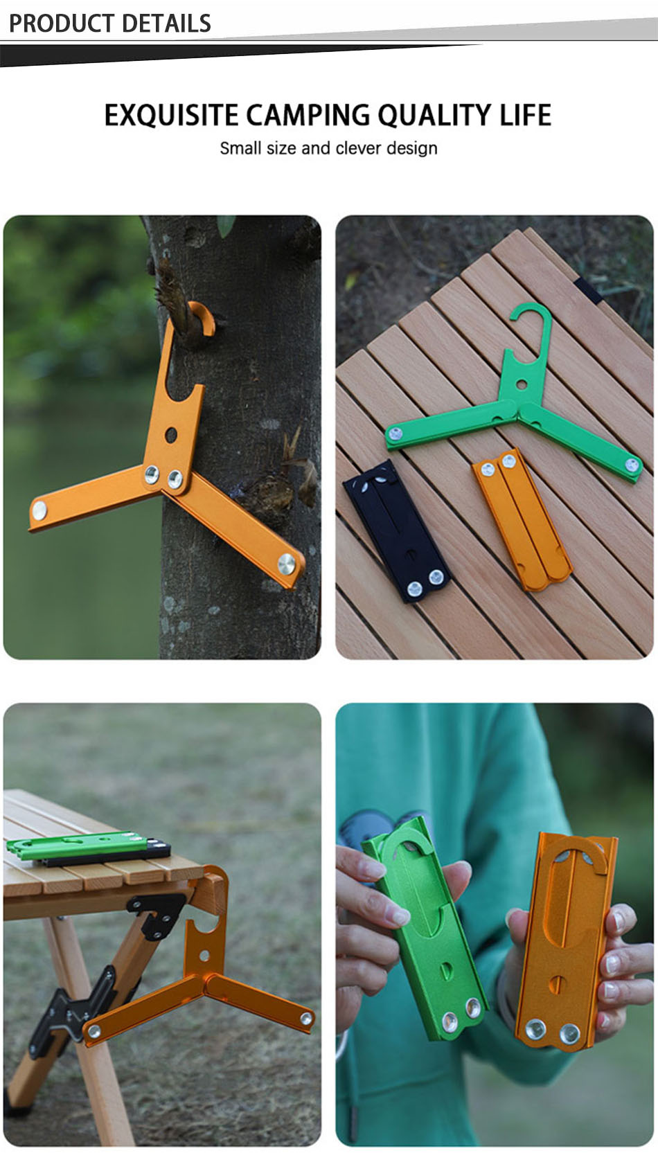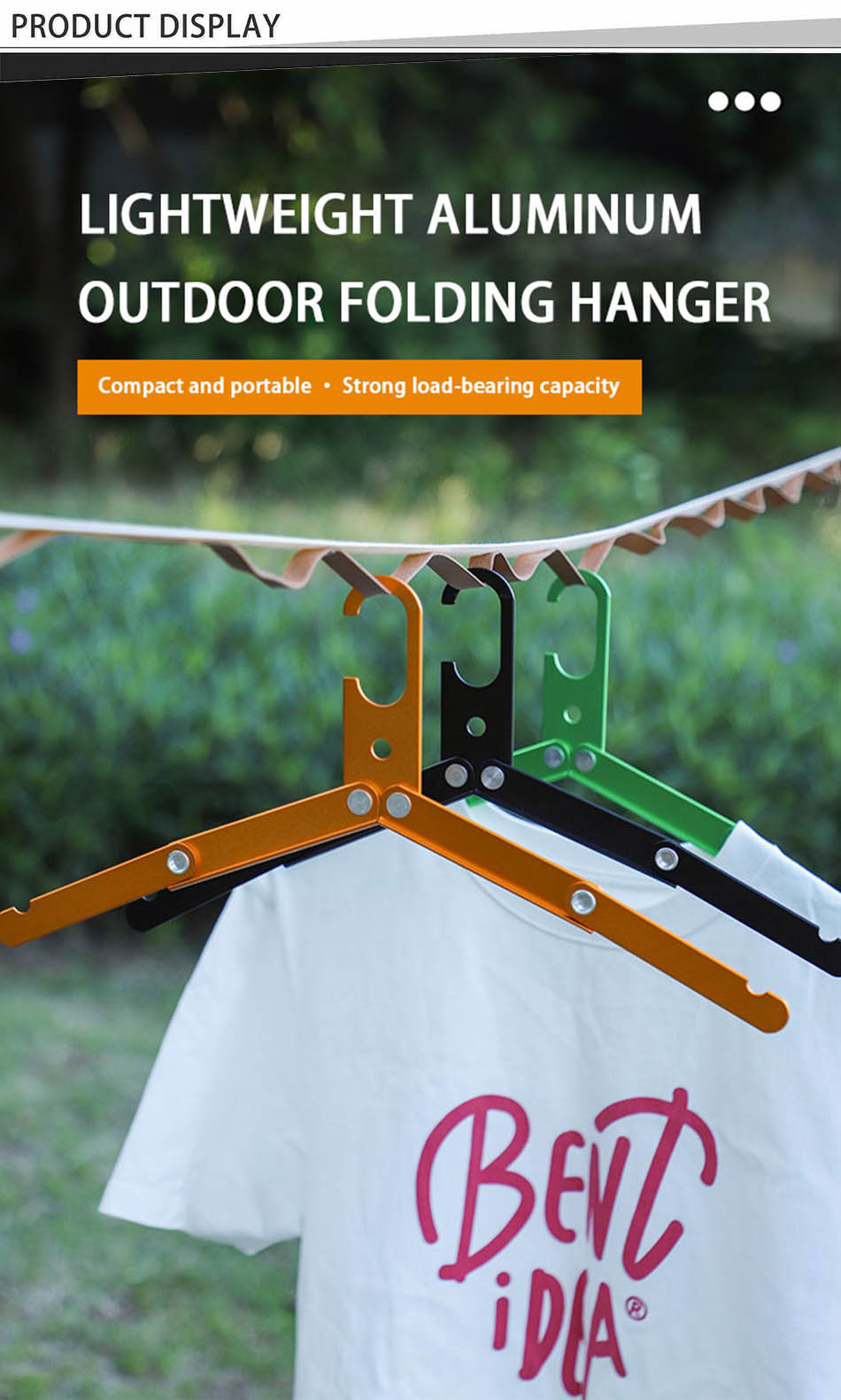 製品 これらの屋外キャンプ用ポータブル アルミニウム合金製折りたたみ式トラベル ハンガーは、軽量、コンパクト、耐久性に優れており、キャンプ、ハイキング、旅行中に衣類を掛けるのに最適です。
