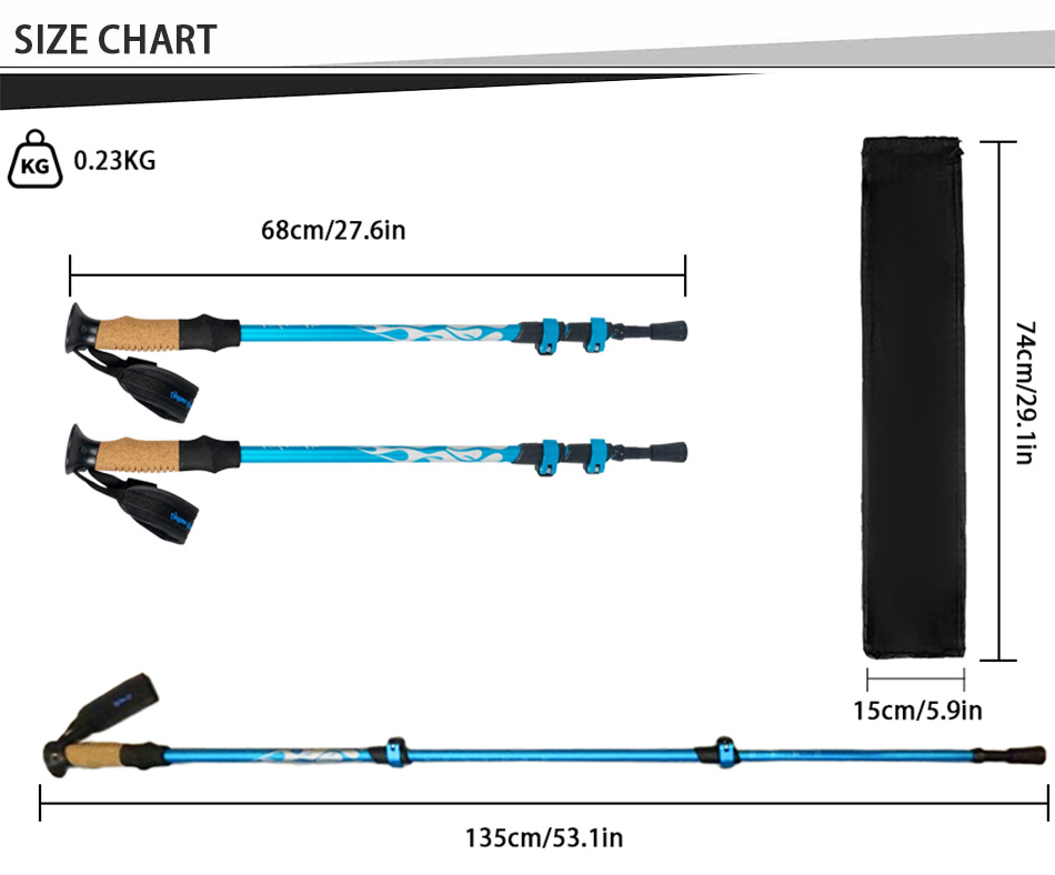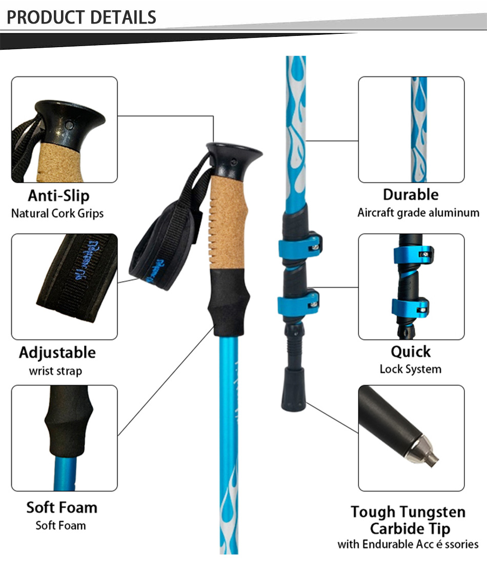 製品 : 工場でカスタマイズされた軽量の屋外ハイキング ポールは、天然コルク グリップと EVA エクステンションを備え、快適性、安定性、耐久性を提供し、トレッキング、登山、長距離ハイキングに信頼できるサポートを提供します。