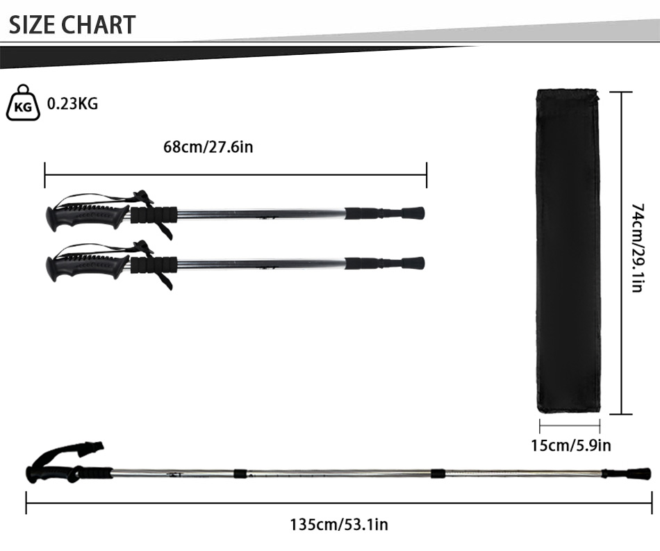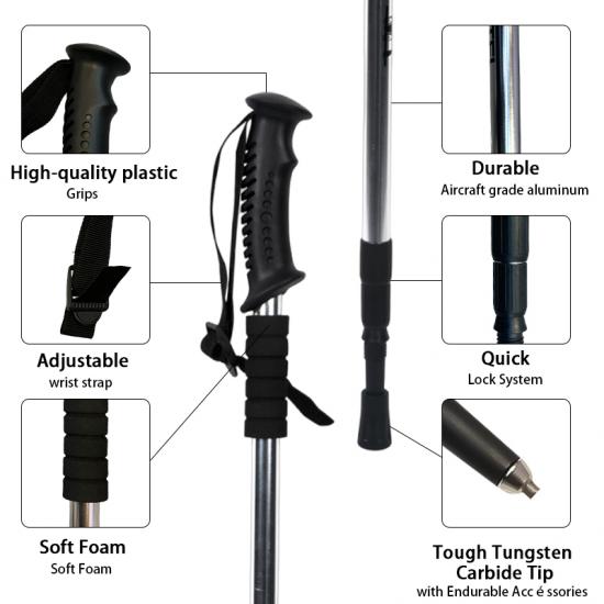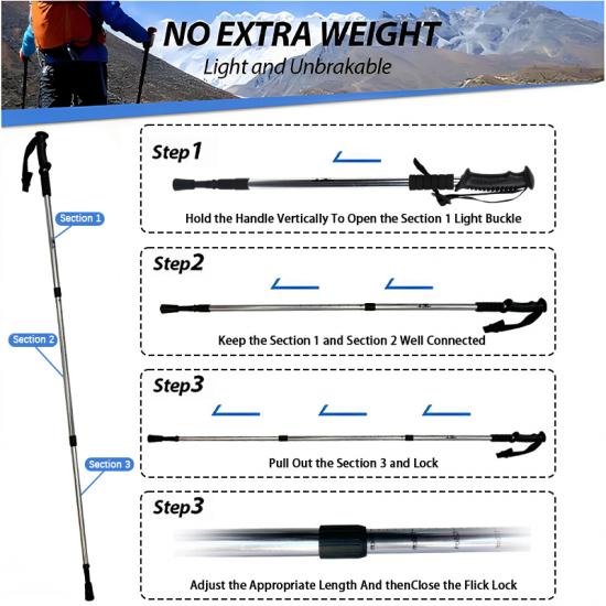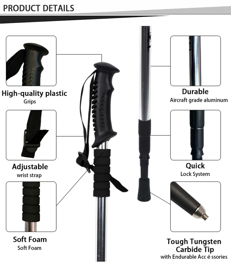 製品 : 屋外用伸縮アルミ合金ウォーキングポールは、軽量設計、耐久性のある内部ロックシステム、快適なゴム製ハンドルを特徴としており、ハイキング、トレッキング、日常の屋外ウォーキングに信頼できるサポートを提供します。