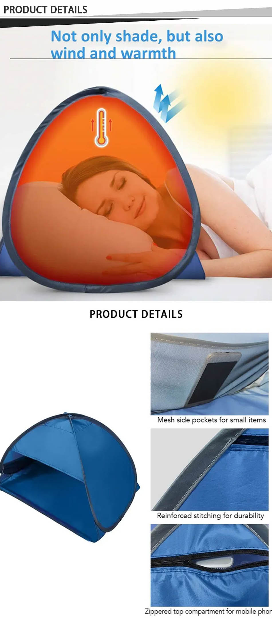 製品 : このポータブルな屋外用ミニヘッドテントは、ビーチでの昼寝、日よけ、キャンプなどに防水性と通気性を備え、いつでもどこでも快適さと日陰を確保します。