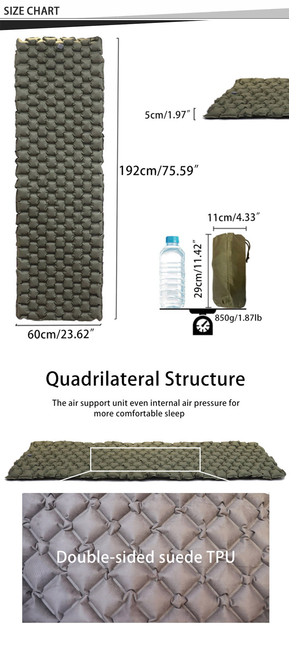 両側に柔らかいスエード表面を備えたプレミアムTPU構造を特徴とする、安らかな睡眠のための優れたクッションと断熱性を提供します。: