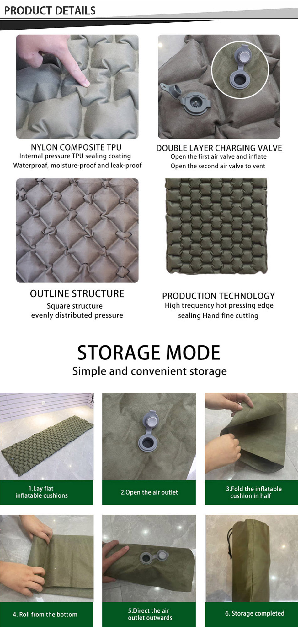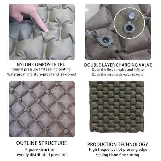 製品 : この超軽量両面スエードの防水TPUインフレータブルキャンプスリーピングパッドは、優れた快適さ、耐久性、および携帯性を提供し、アウトドアアドベンチャー、ハイキング、バックパッキング旅行に最適です。